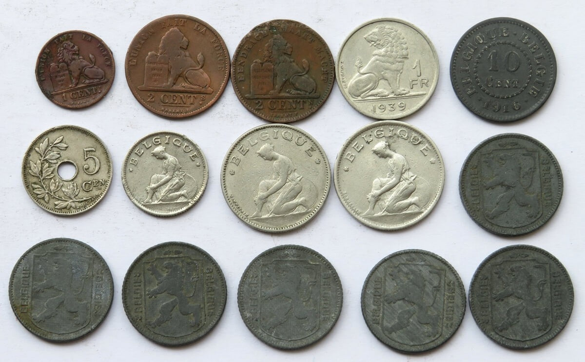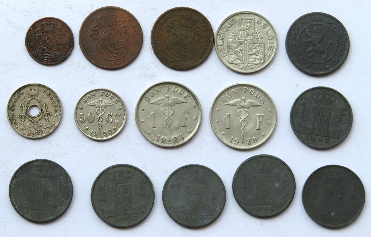 Belgia, zestaw monet 1873-1944, 15 sztuk