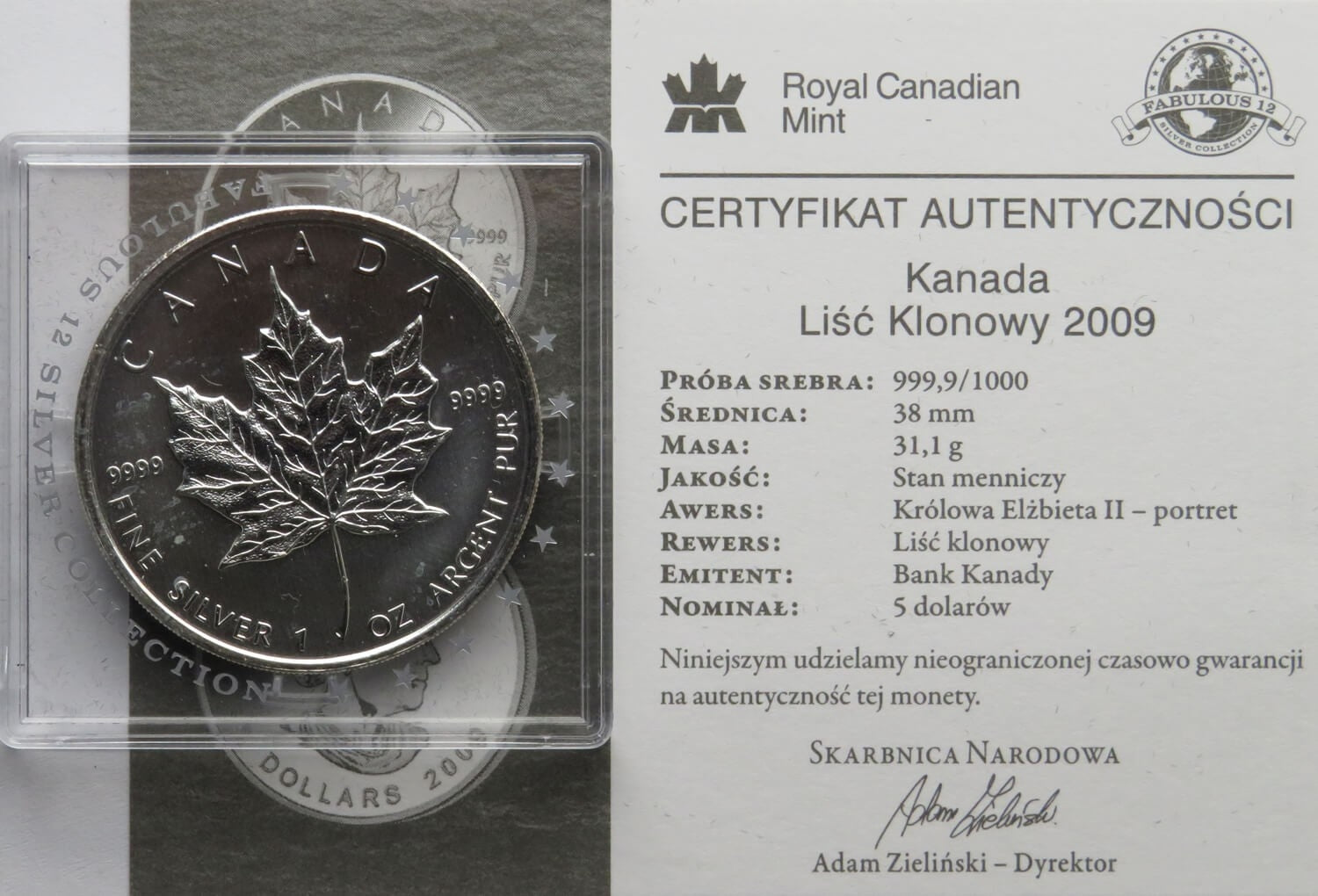 Kanada 5 dolarów Liść klonowy, 2009, Ag999, 1OZ