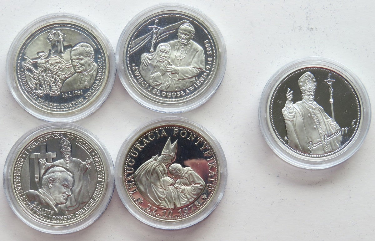 Medale Jan Paweł II, 5 sztuk i dedykowana kaseta