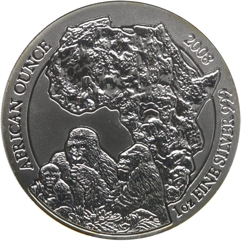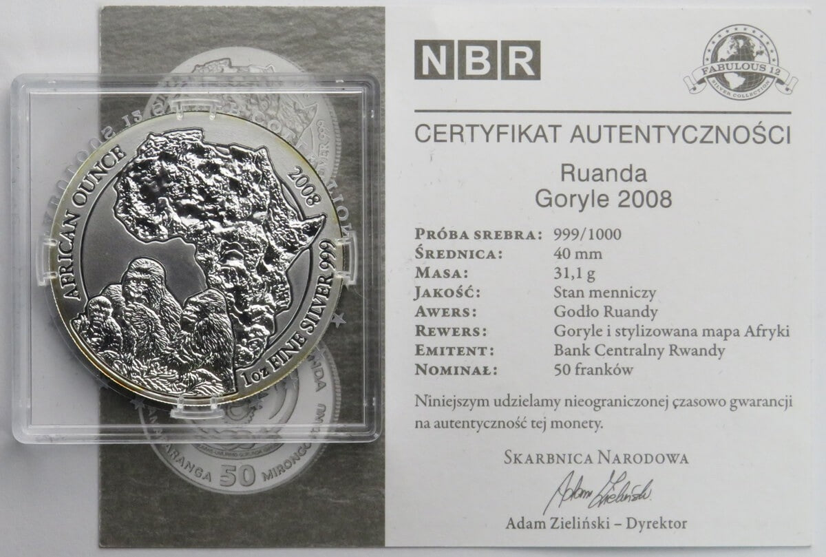 Ruanda 50 Franków 2008 Goryle, Srebro, Ag999, certyfikat
