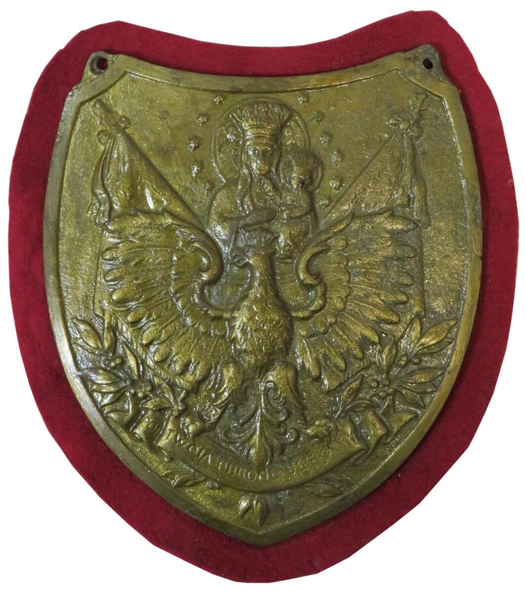 Ryngraf - Pod Twoją obronę uciekamy, odlew, w tle fragment sztandaru straży pożarnej