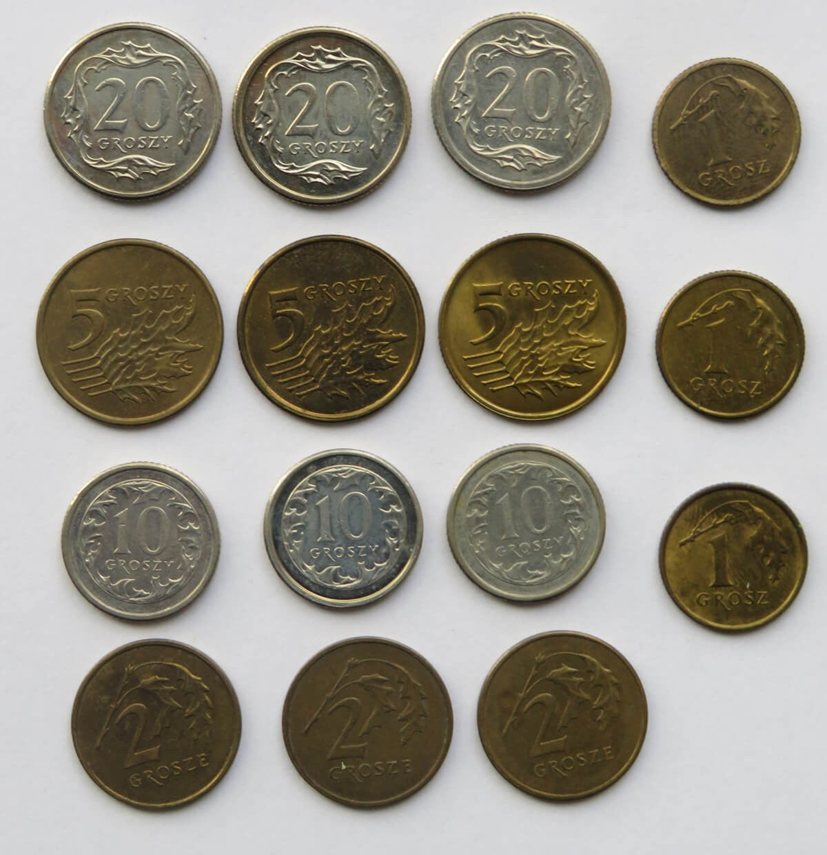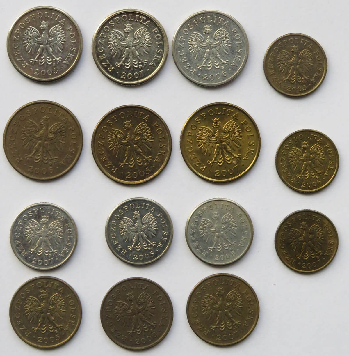 Zestaw 15 monet groszowych z lat 2005-2007 (od 1 do 20 groszy), stany 1 / 1-