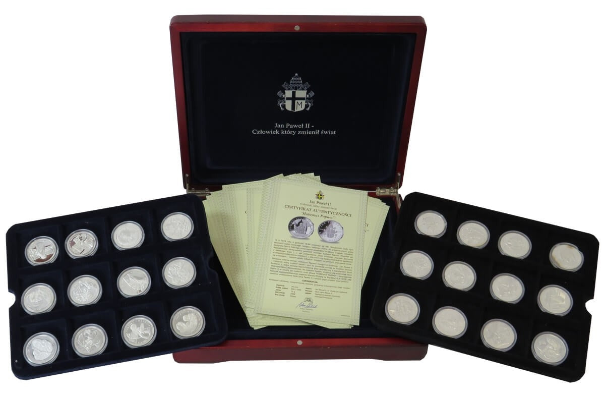 Zestaw 24 medali z Janem Pawłem 2, srebro + kaseta + certyfikaty